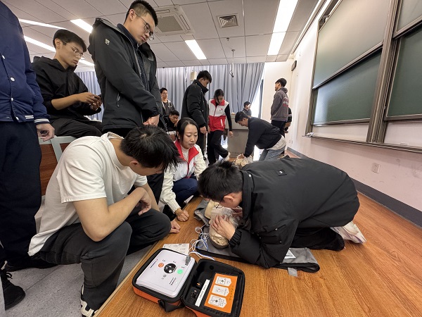在实操环节,培训老师现场演示了CPR与AED配合使用的完整流程,并组织学员进行模拟练习。针对气道异物梗阻等突发情况,老师手把手教学员掌握海姆立克急救法等实用技能,确保每位参与者都能在指导下正确、规范地完成操作。 学生李双宇说道“在学院组织的应急救护培训中,我系统学习到了心肺复苏和海姆利克急救法的完整流程。当双手在模拟人身上按压时,才真切体会到“黄金四分钟”里每一秒的重量。这不仅是一门技能,更是一份对生命的责任。特别感谢红十字会志愿者的耐心指导,希望通过不断练习,让知识转化为关键时刻的勇气与能力。敬畏生命,守护身边人——这是我们应当具备的素质与担当。” 学生王泽涵说道“参加CPR+AED应急救护培训,我的收获远超预期。理论课上,老师清晰讲解了心肺复苏的按压频率、深度和开放气道等要点,也强调了AED电极片贴放位置、避开金属物等细节,让我明白急救既要迅速又要细心。实操环节,从生疏到熟练,每一次调整都让我的操作更加规范。这次培训让我掌握了救命技能,也深知应急救护不仅是知识,更是守护生命的责任。”